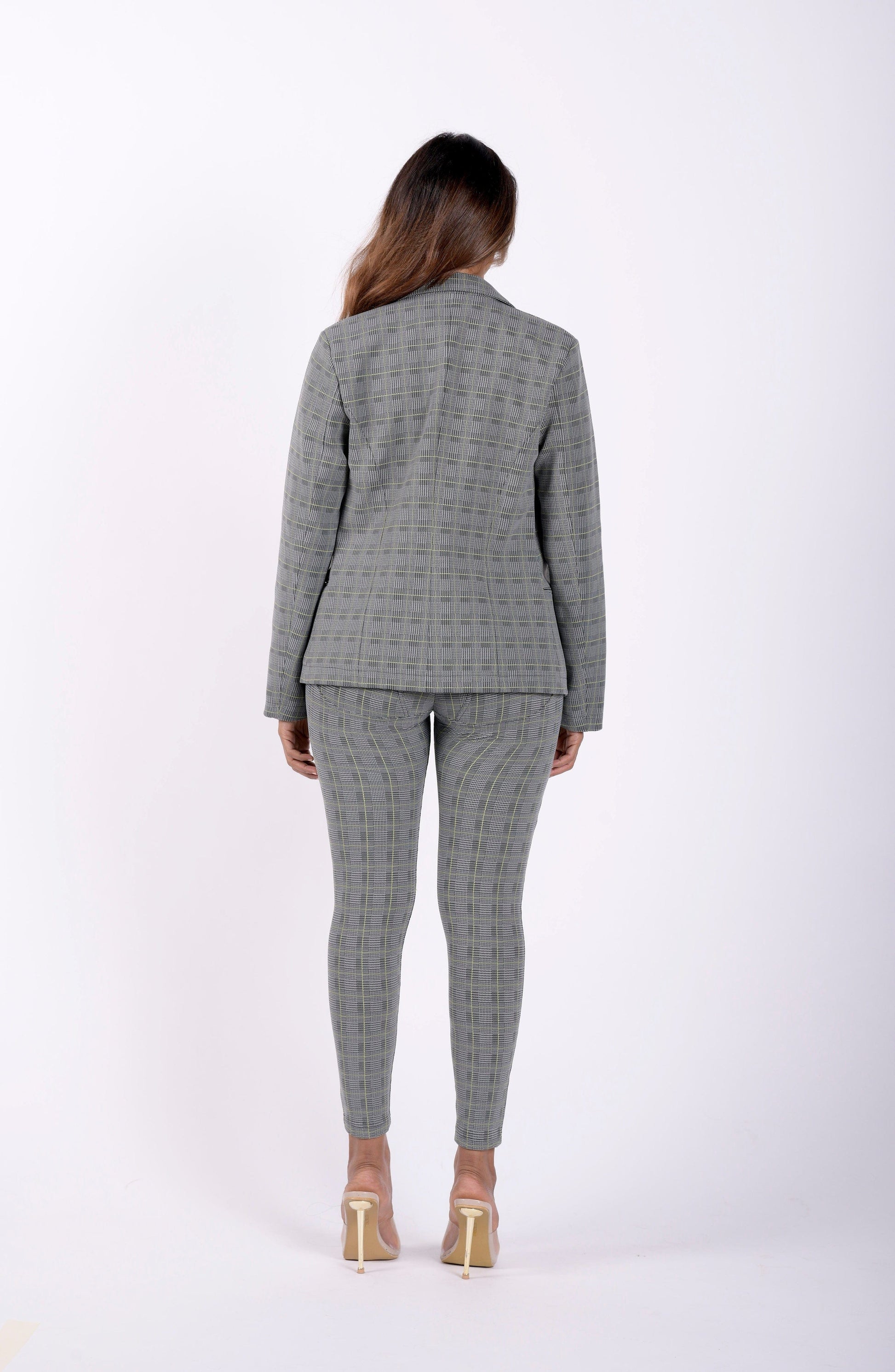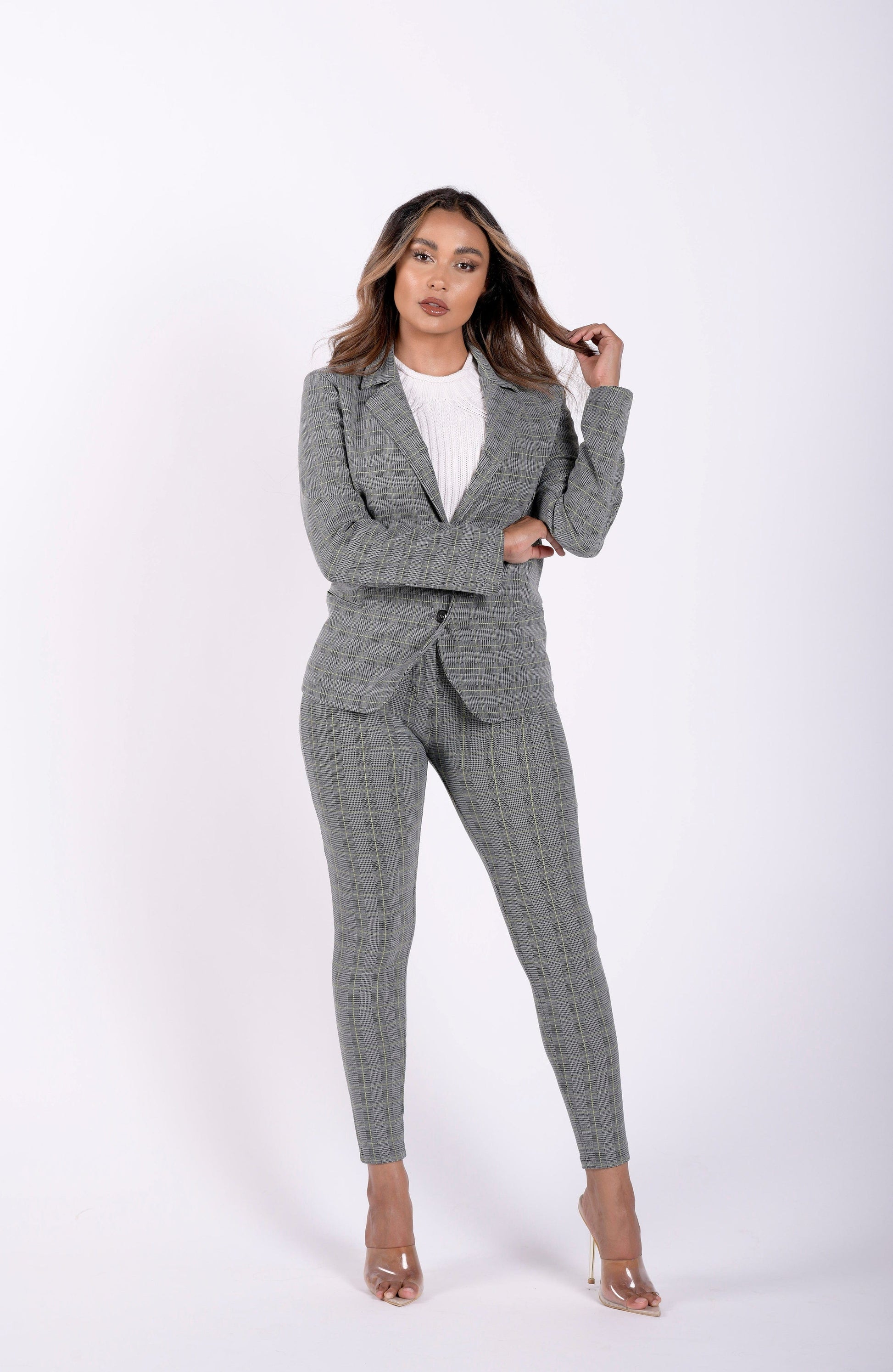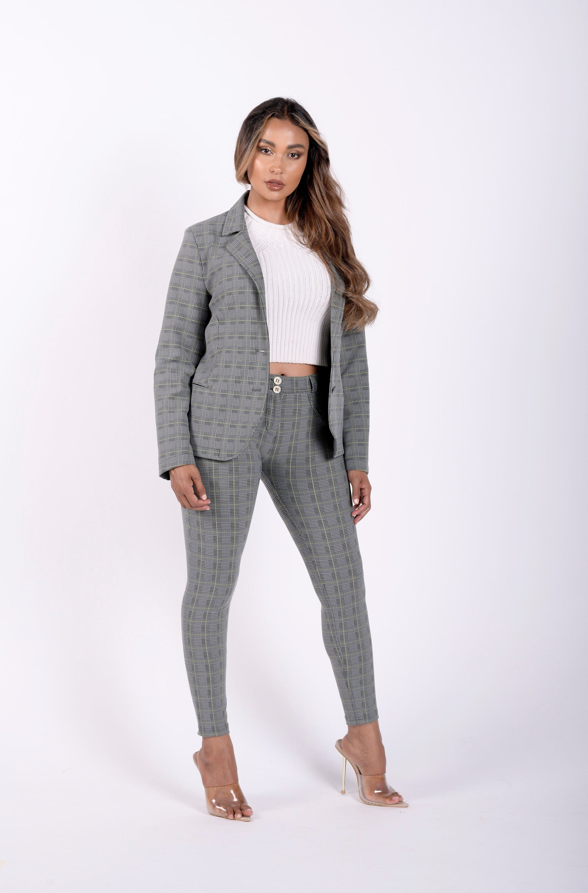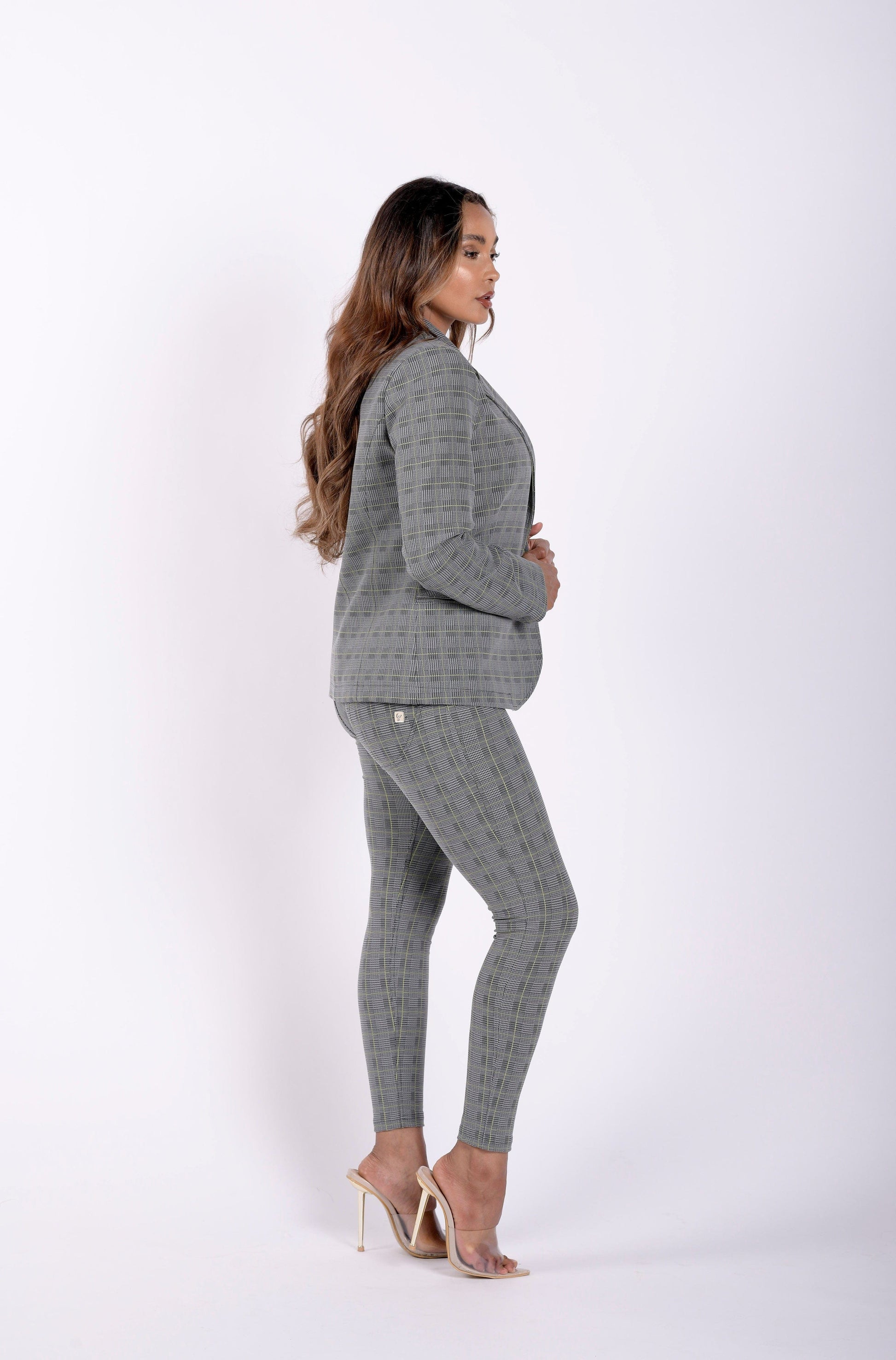 This made in Italy blazer is an absolute game-changer. Made from high quality patented DIWO PRO fabric with an inner lining of satin, makes this piece, soft, stretchy and tailored to a woman's silhouette. Let your outfit do the talking and stand out with a classic tailored checkered grey plaid blazer. Everyone's wardrobe requires a classic blazer that's versatile, but most importantly, comfortable, well-fitting and affordable. It's a no brainer, this classic piece will last you through the ages, it boasts luxury as it's made in italy from high-end fabric, without the luxury tax!
