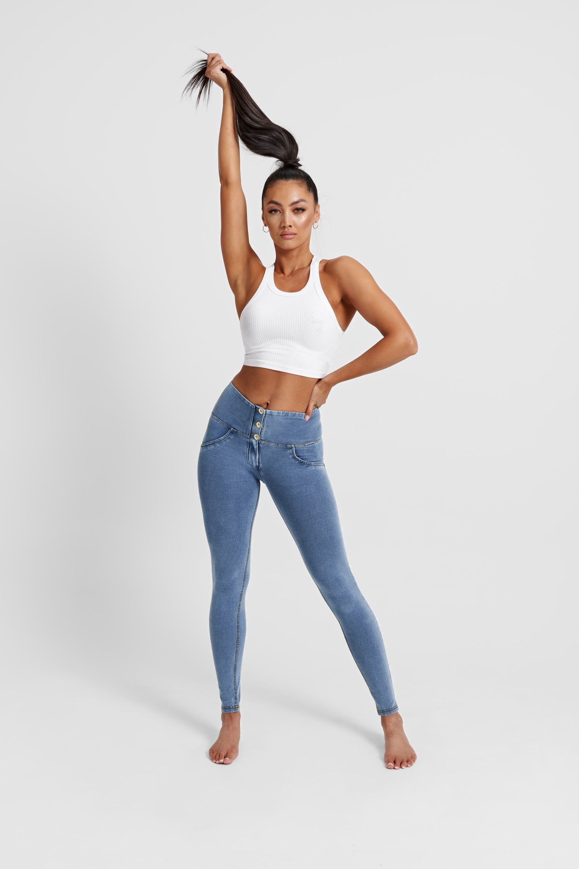 WR.UP® Denim - 3 Button High Waisted - Full Length - Light Blue + Yellow Stitching