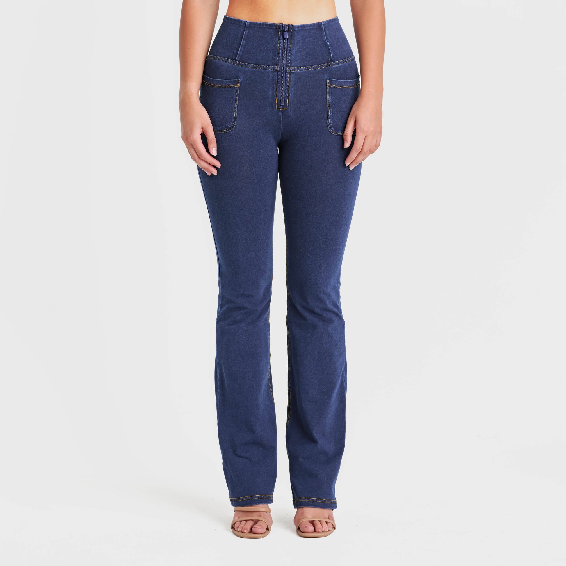 WR.UP® Denim with Front Pockets - Super High Waisted - Flare - Dark Blue + Yellow Stitching