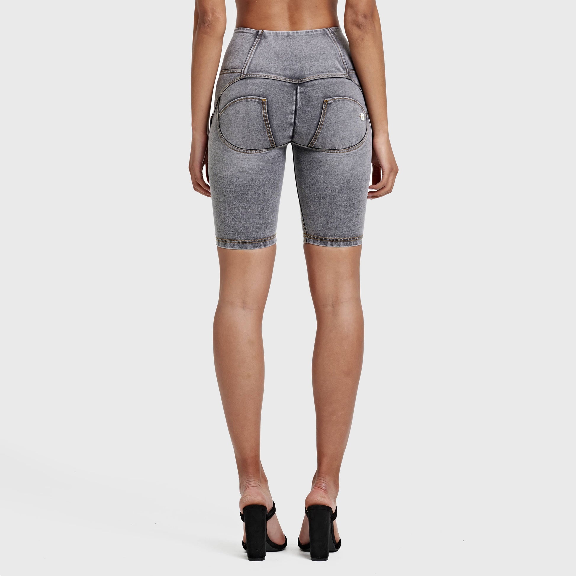 WR.UP® Distressed Denim - High Waisted - Biker Shorts - Grey + Yellow Stitching