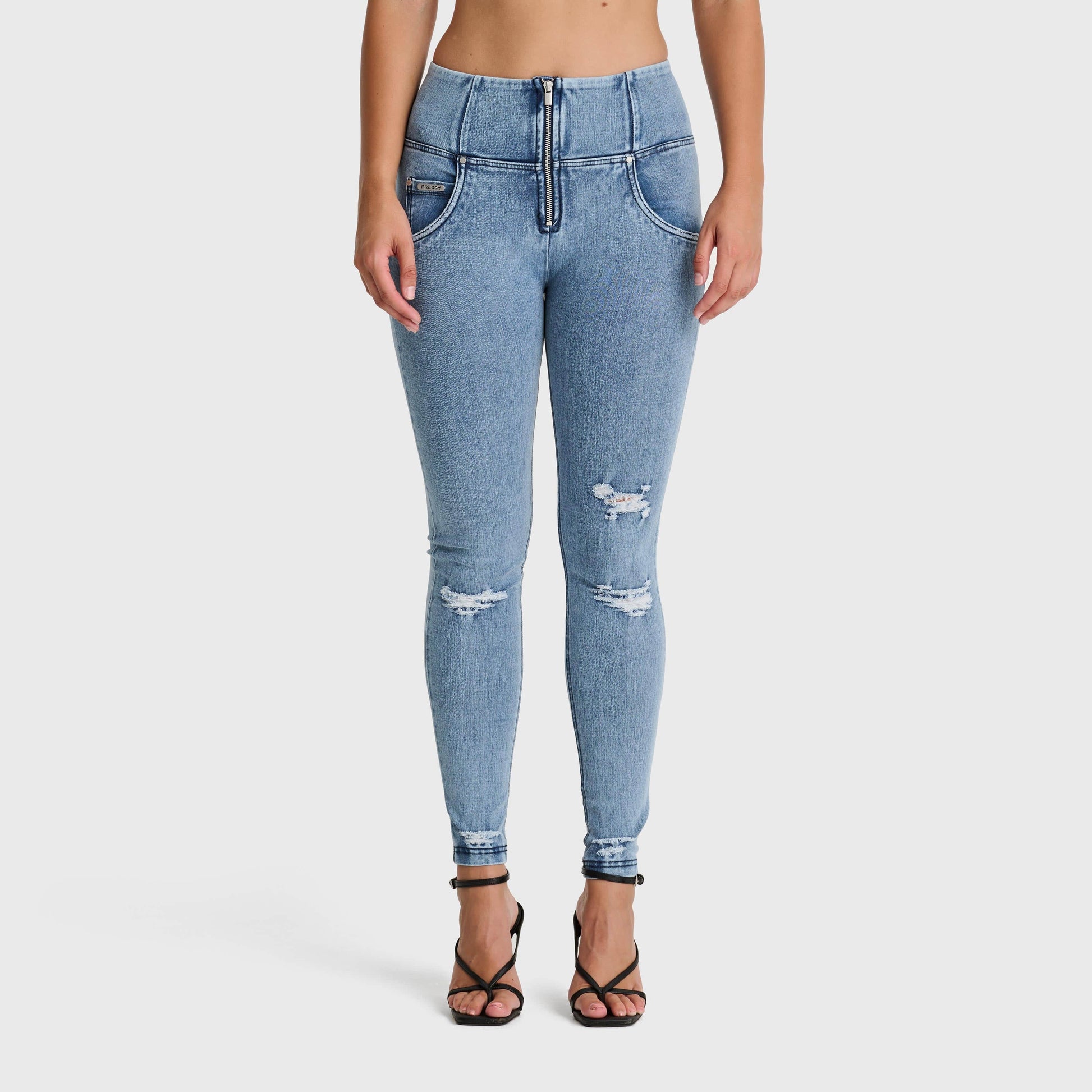 WR.UP® Snug Distressed Jeans - High Waisted - Full Length - Light Blue + Blue Stitching